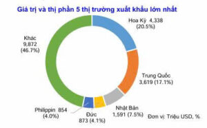 Châu Á vẫn là khu vực dẫn đầu với kim ngạch 8,82 tỷ USD, chiếm khoảng 42% tổng xuất khẩu, chỉ giảm nhẹ 1,3% so với cùng kỳ. Hoa Kỳ ghi nhận mức tăng trưởng mạnh (+12,6%) và giữ vững vị trí là thị trường lớn thứ hai với 4,83 tỷ USD.